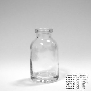 | 型號 | 口徑 ISO/SFDA-20 | 瓶高(mm) | 瓶身直徑(mm) | 料重(g) | 容量(ml) |